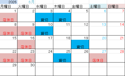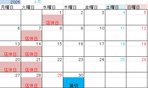 2026年1月、2月、3月、4月、5月、6月の店休日をお知らせいたします。