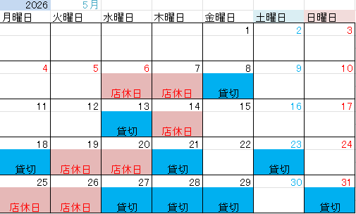 ※店休日及び貸切営業日は変更になる場合がございます。